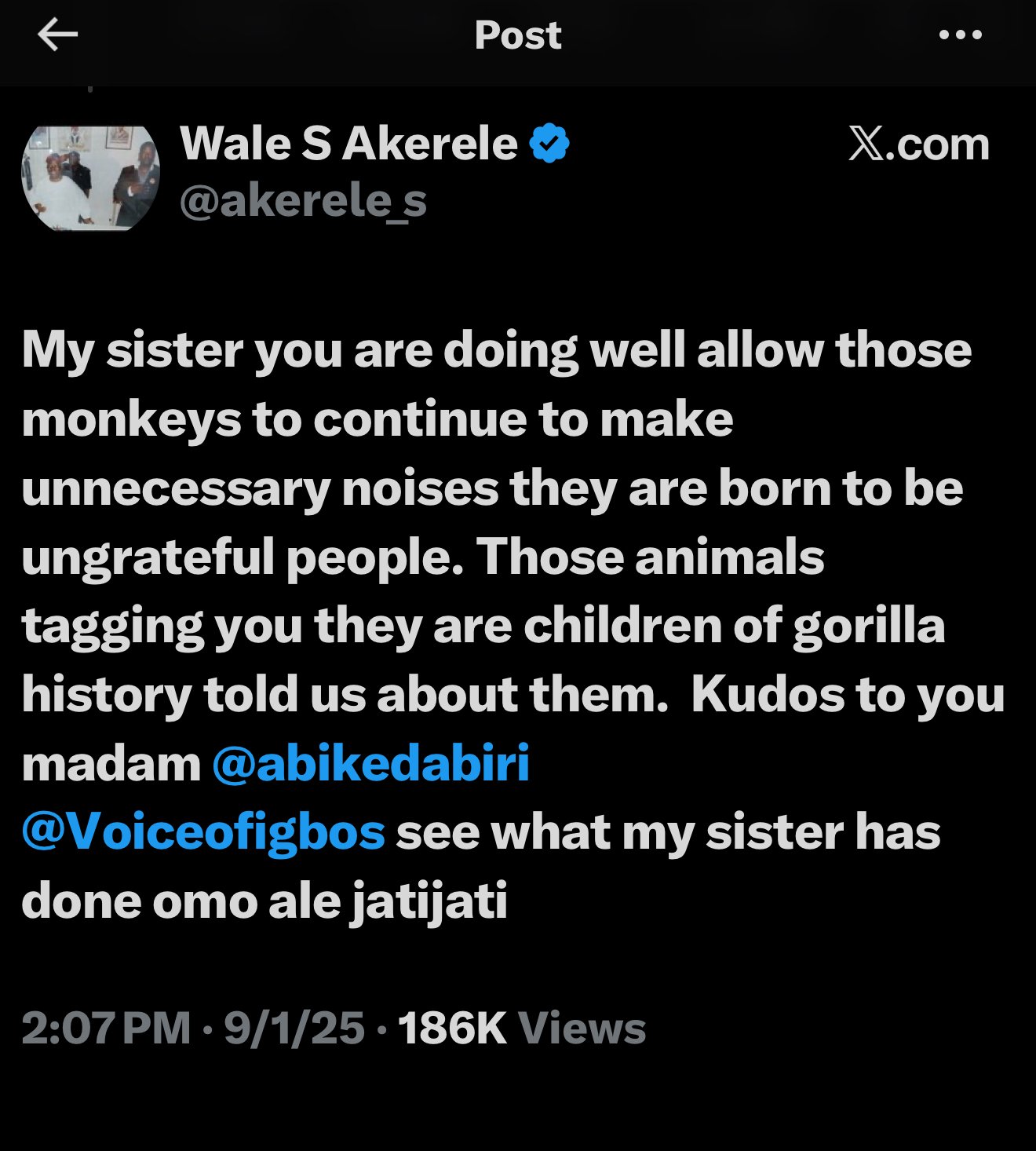 In reaction to Mrs Dabiri-Erewa’s post, an X user, Wale Akere, posting via @akerele_s, lauded the NIDCOM boss for her work while berating Igbos as “monkeys, children of gorillas and bastards.”
