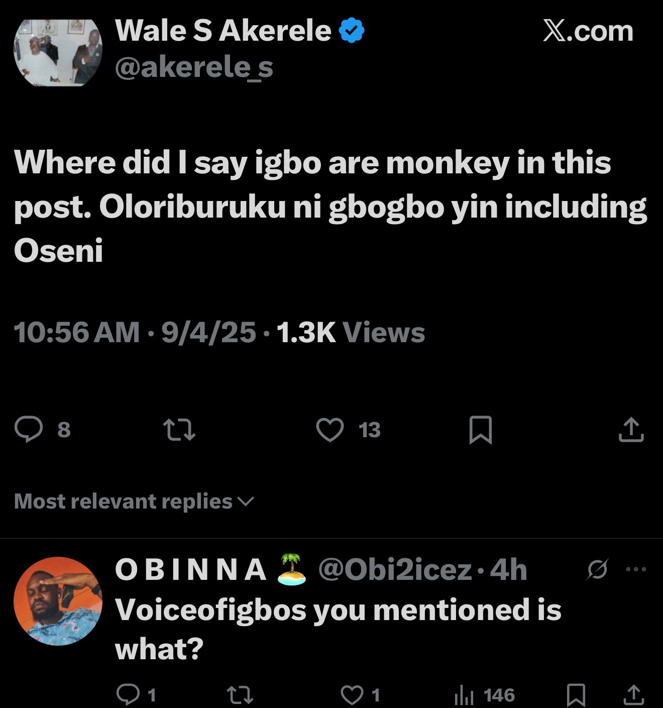 However, after the tweet went viral, Wale wrote: “Where did I say igbo are monkey in this post. Oloriburuku ni gbogbo yin including Oseni.”