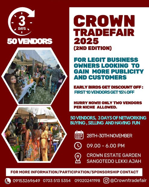 From November 28th to November 30th, the serene Crown Estate in Sangotedo, Ajah-Lekki came alive with colour, culture, creativity, and commerce as residents hosted the maiden edition of the Crown Estate Trade Fair—and Listing Lasgidi, your No. 1 Lagos Lifestyle Platform, was proudly on ground to capture all the action.