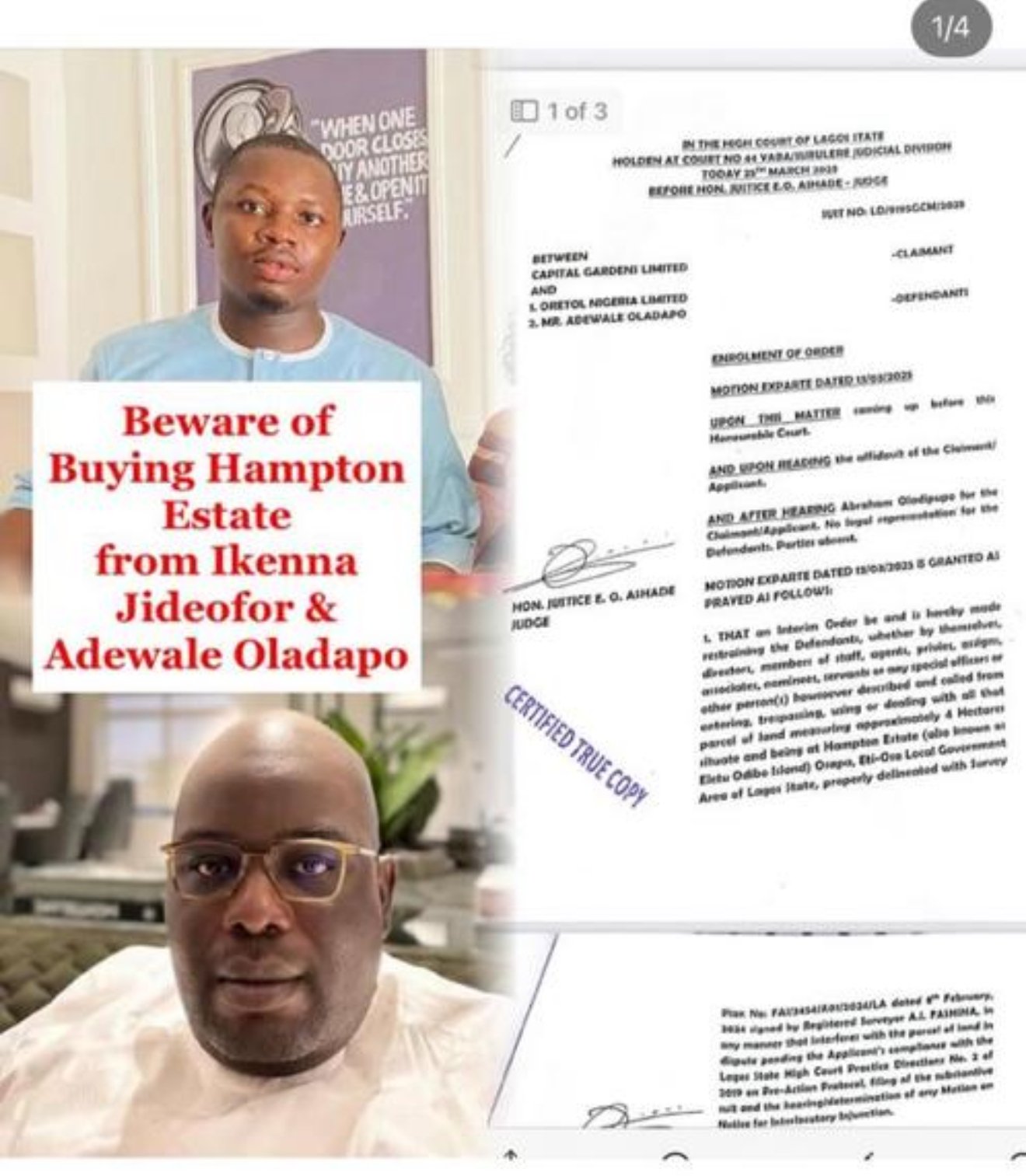 Years ago, Capital Gardens bought four hectares of land from Oretol Nigeria Limited belonging to one Adewale Oladapo, aka Biggie but years later, Oretol Nigeria Limited turned around four years later to approach Capital Gardens that it’s no longer selling and the case was taken to court.