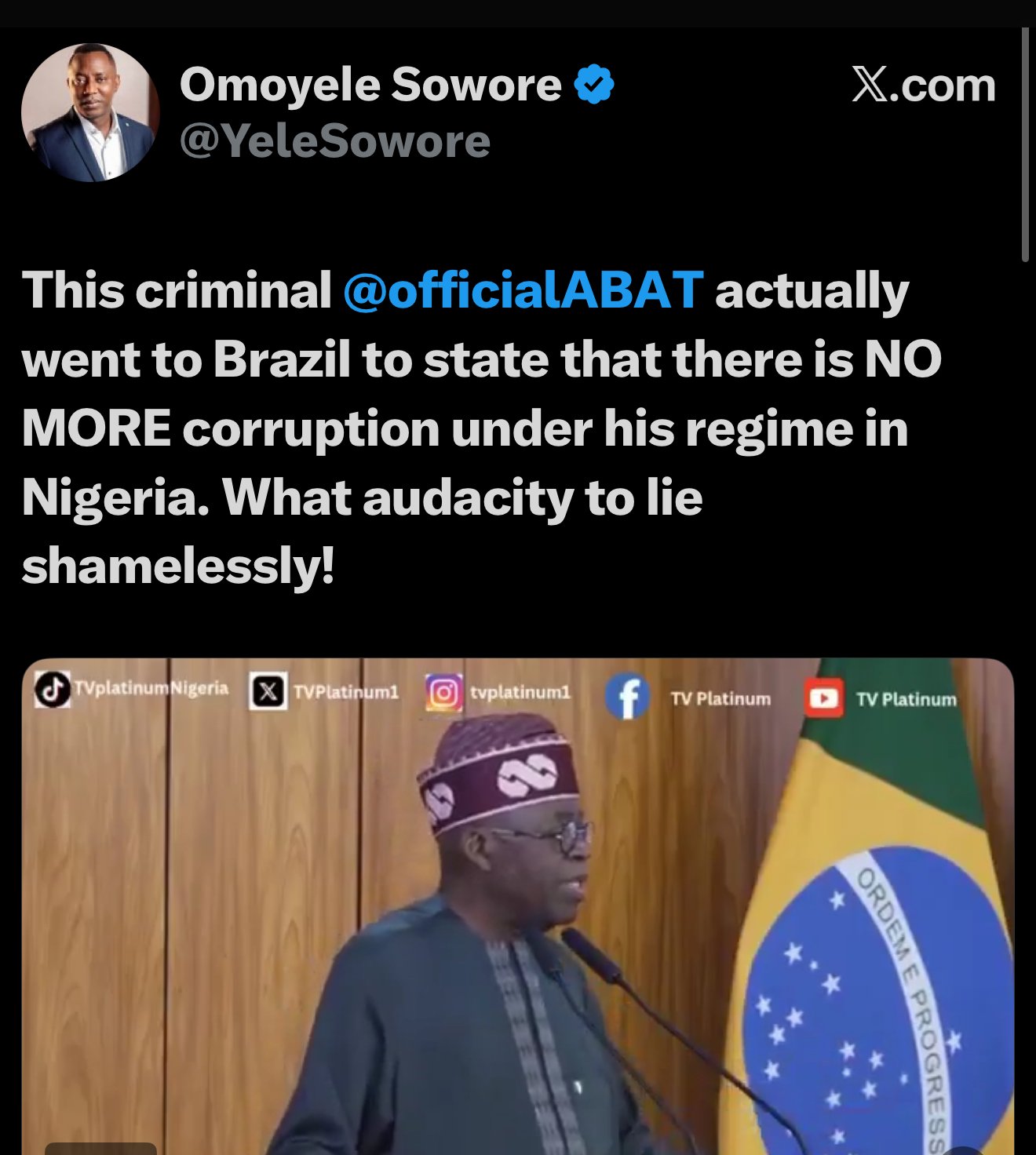 “We detected and monitored with dismay and consternation a widely condemned publication/trending Tweet by Omoyele Sowore on his X official handle page @YeleSowore on 25th August, 2025 about 11:38 PM local time (2338 hours) WAT disparaging and ridiculing the President of the Federal Republic of Nigeria.