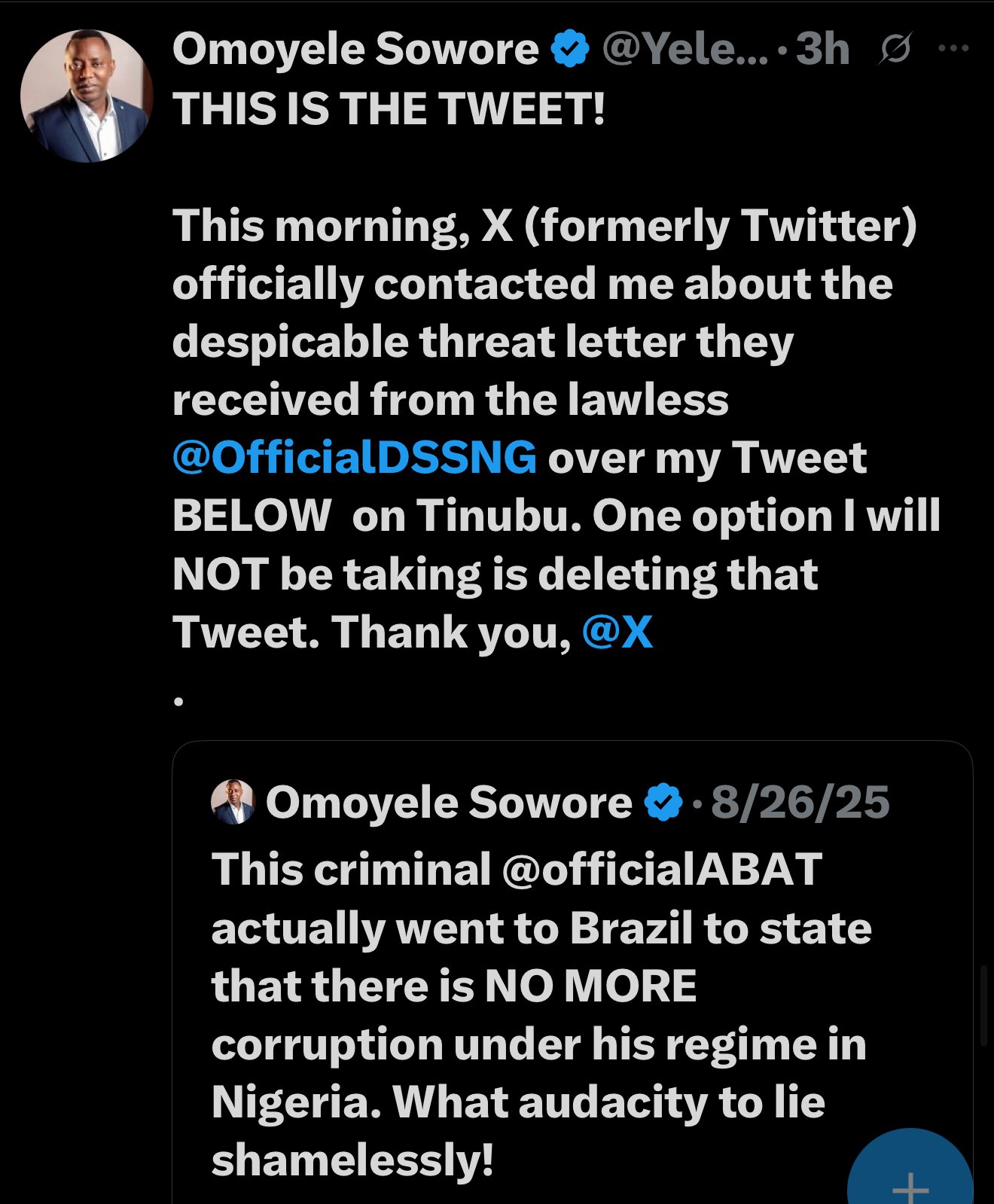 The Nigeria’s intelligence security agency, in a petition addressed to the Chairman and CEO of X Corp. Bastrop County in Texas, United States of America (USA) and dated September 6,2025, accused Sowore of targeting President Bola Ahmed Tinubu with a disparaging and ridiculous tweet capable of creating political tension and threatening the country’s national security.